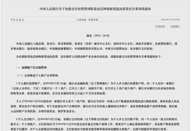 不久前,央行下发了银发〔2016〕261号文件