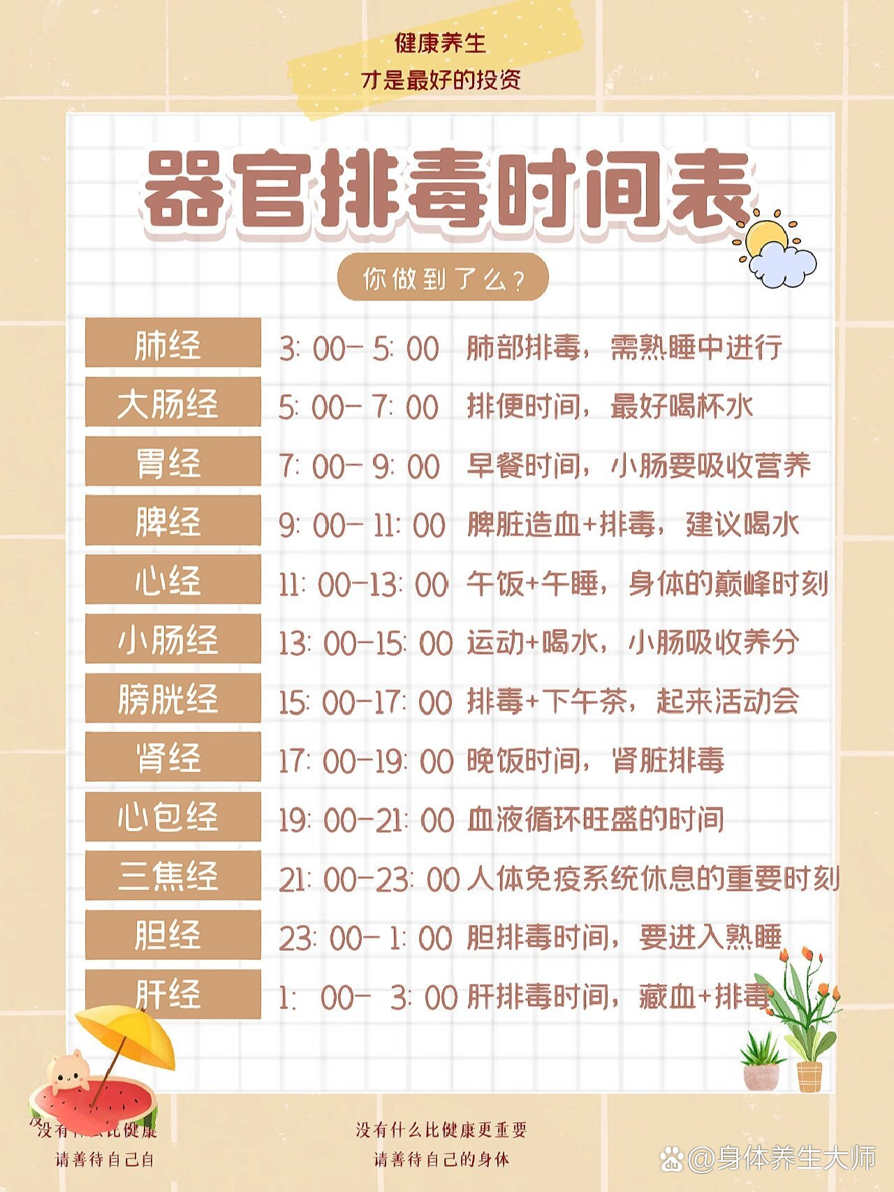 一、晚上9-11点为免疫系统(淋巴)排毒时间,此段时间应安静或听音乐。