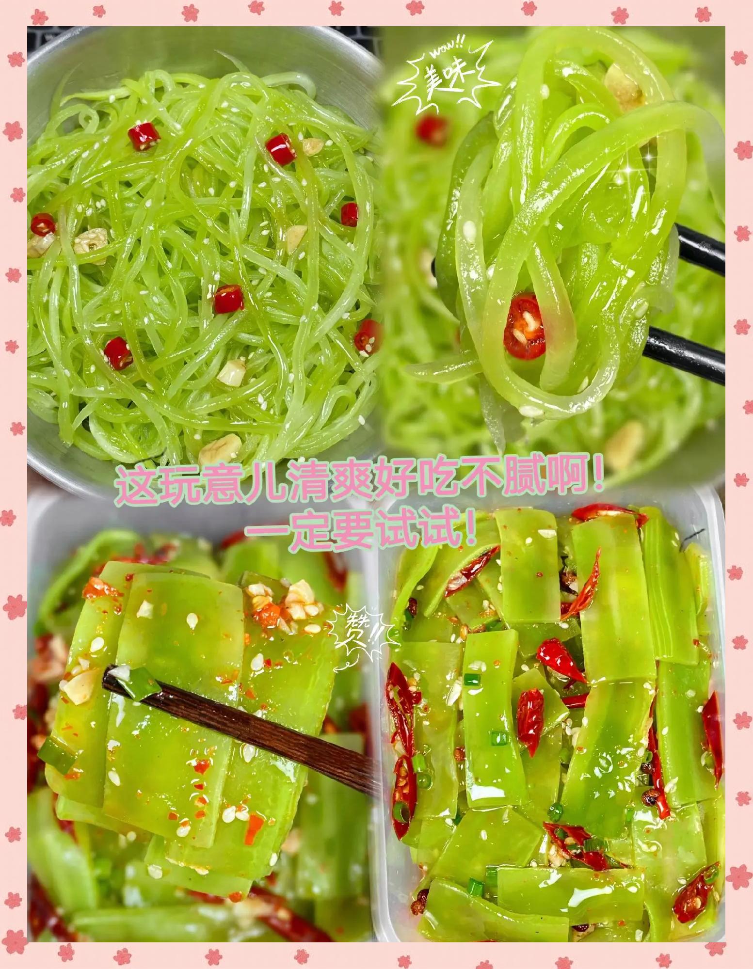 凉拌莴笋丝。莴笋去皮,切成细丝,放入水中浸泡5分钟,捞出沥干水,加入调料拌匀即可。