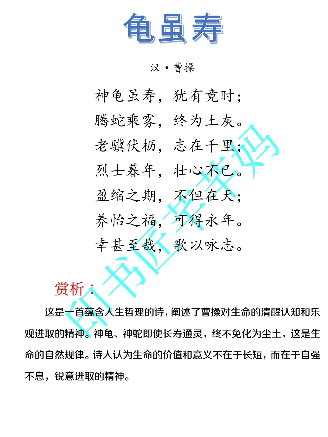 1、作者曹操(155——220),字孟德,沛国谯郡人,东汉末年的政治家、军事家、诗人。他是建安时期的代表诗人之一,精于兵法,著有《孙子略解》等军事著作。其诗以慷慨悲壮、宏伟壮观著称。著有《蒿里行》《短歌行》《苦寒行》《龟虽寿》《观沧海》等诗篇。