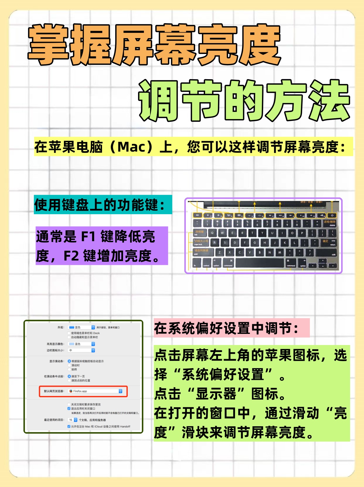 选择“系统偏好设置”,然后点击“显示器”选项卡在显示器设置中,通过拖动亮度滑块来调整屏幕亮度方法二利用物理按键调节台式电脑亮度显示器物理按键找到台式电脑显示器上的物理按键区域寻找带有太阳或灯泡图标的亮度调节键按下该键后,根据屏幕提示或显示器上的菜单,使用其他按键如上下箭头键。