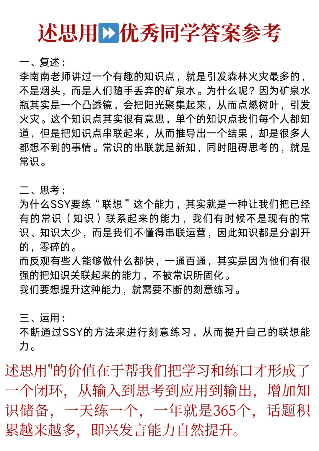 你能把你的想法用15个词总结出来吗?如果不能,那就再总结。演讲对信息的传递并非理想中的那么强有力,所以在演讲中不断重复这15个词的总结可以达到强调和加深记忆的效果。