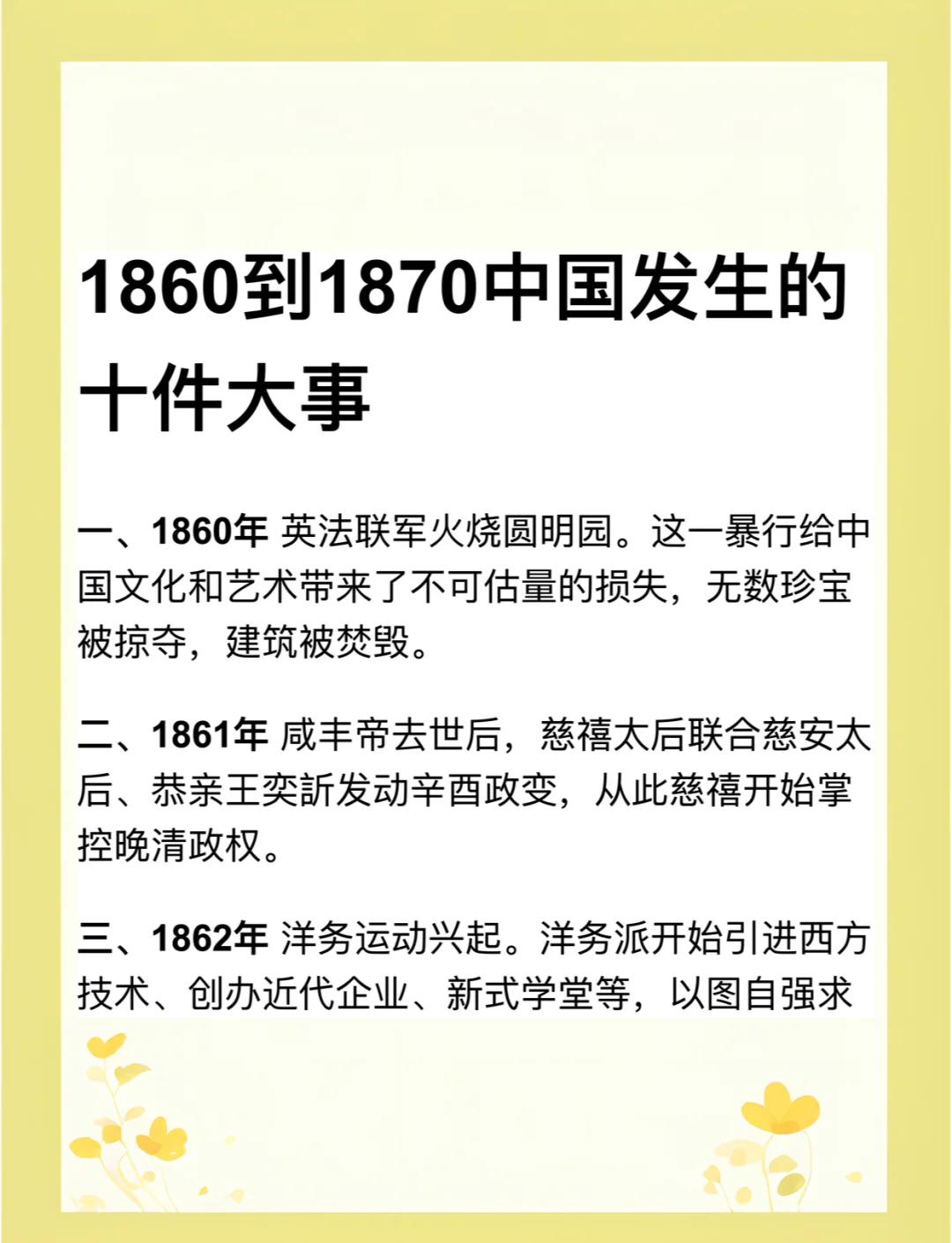 16、1851—1864年太平天国运动:1851年金田起义是爆发的标志;1853年定都天京是正式建立政权的标志;1859年颁布《资政新篇》,这是要求在中国发展资本主义的第一个方案