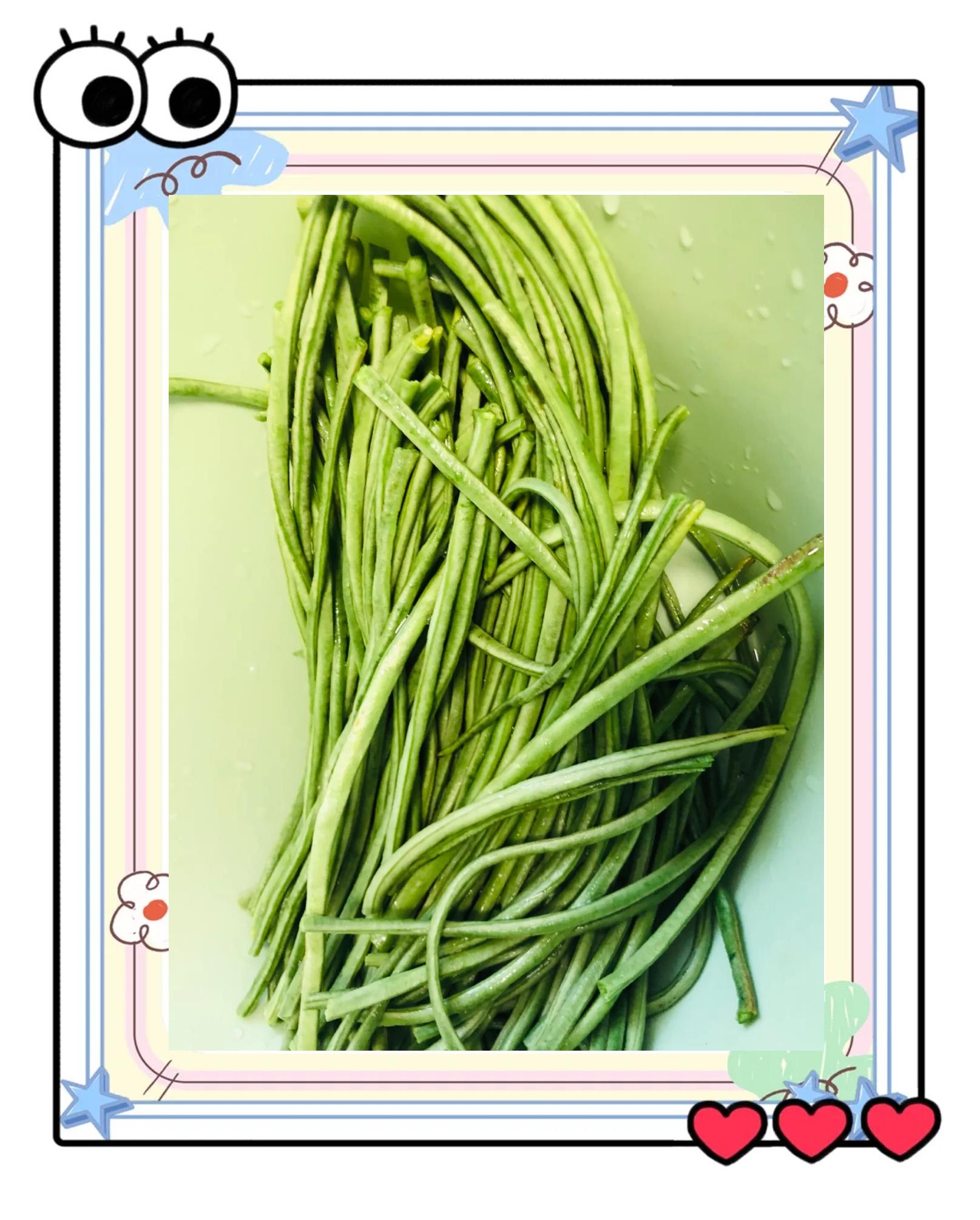 把豇豆切成1--2厘米长,蒜切碎。